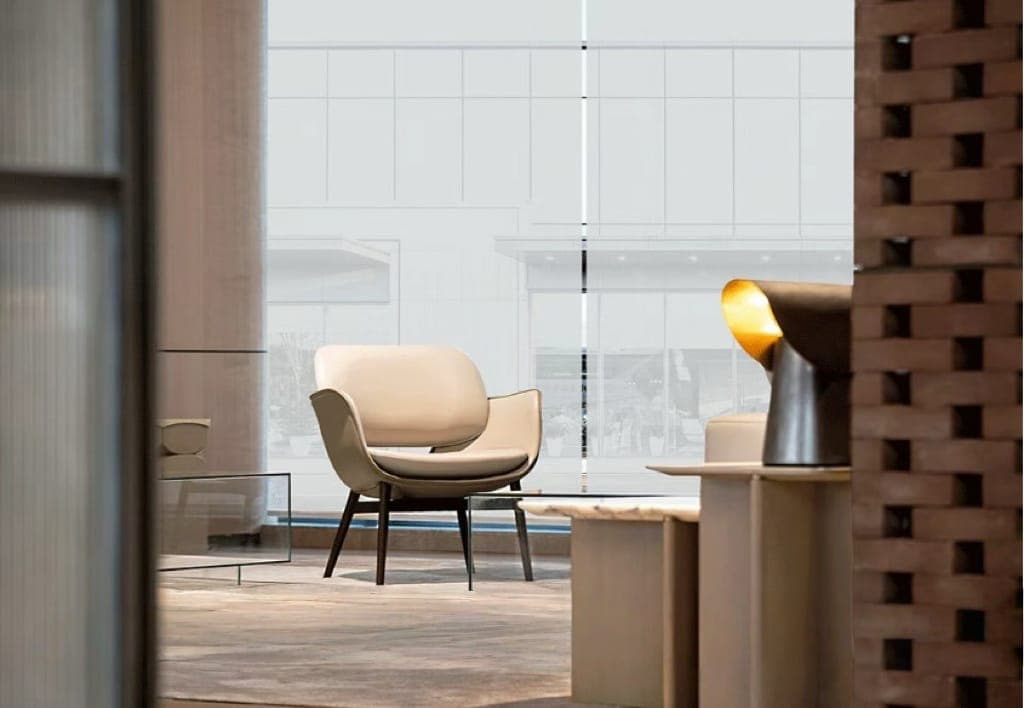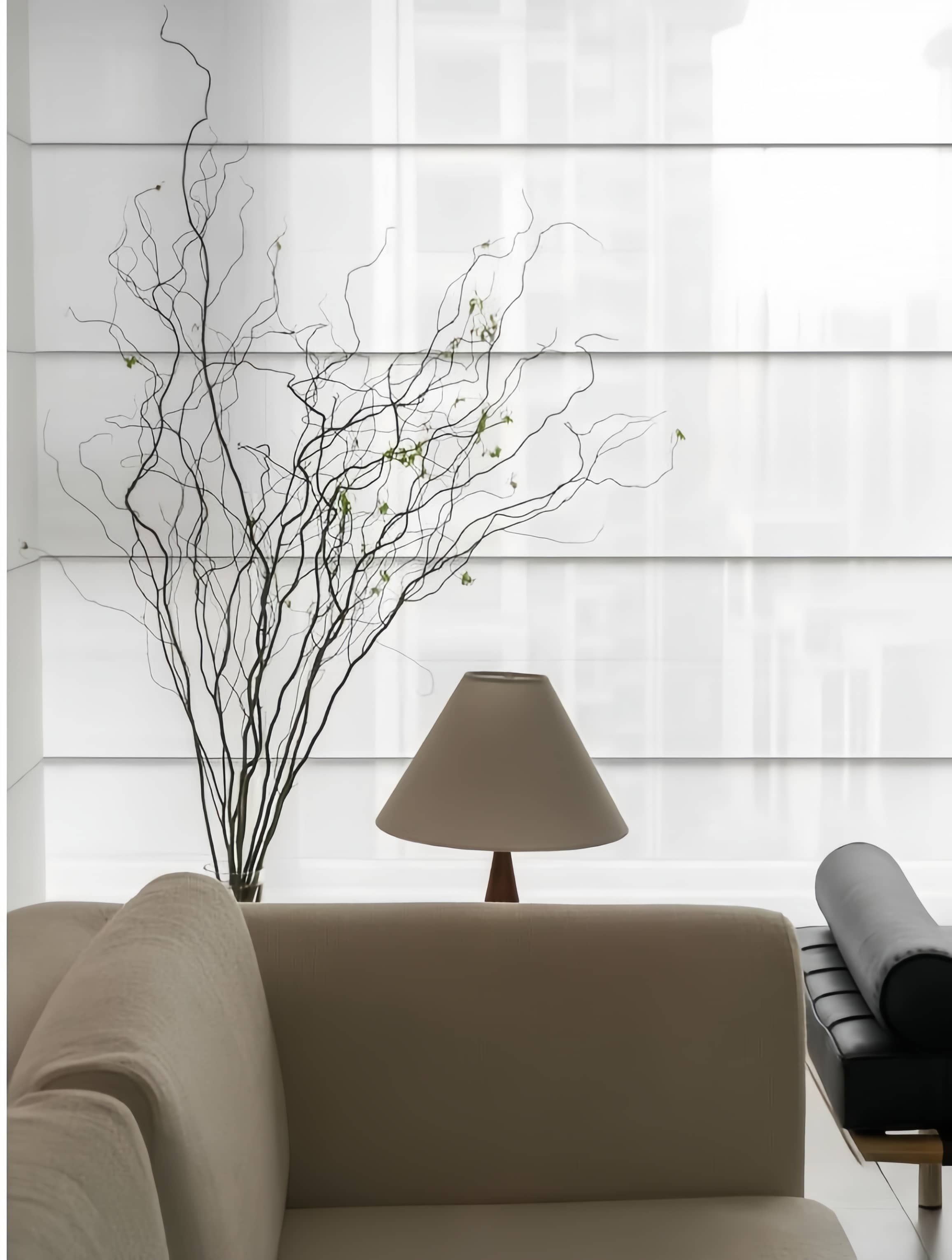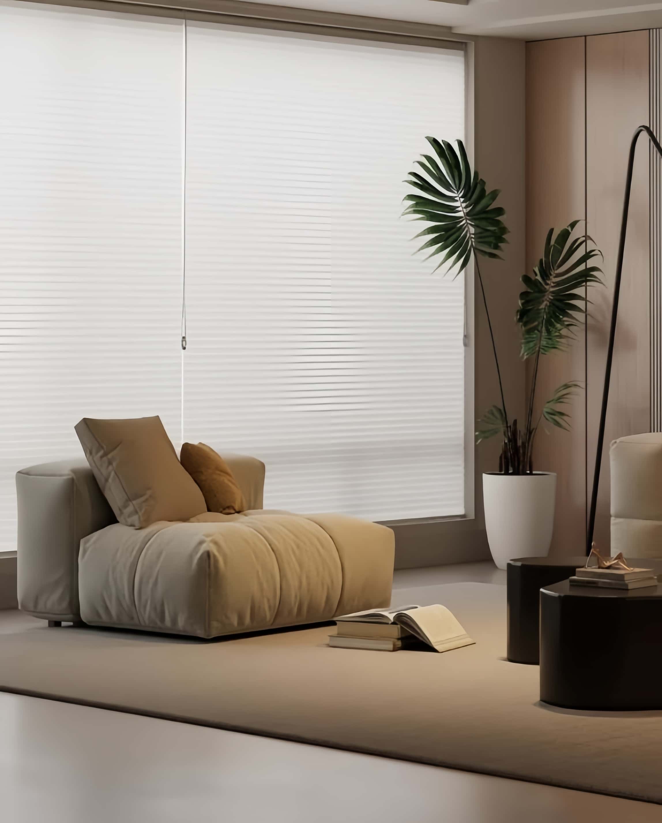 A luxurious blend of sheer curtains and blinds. Fabric vanes float between sheer layers to diffuse harsh sunlight, creating a soft, dreamy glow while maintaining daytime privacy. Elegant and refined.